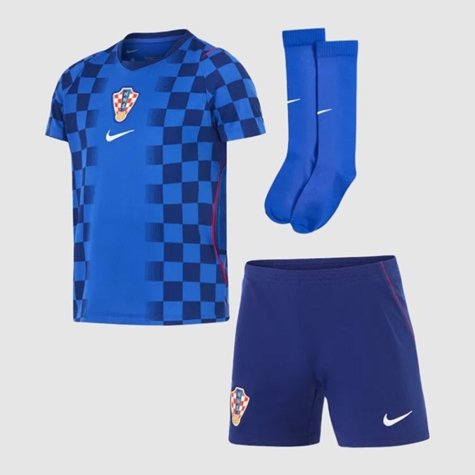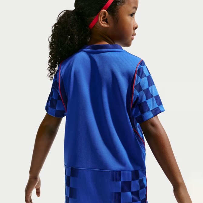 Karakterističan uzorak kockica zadržan je kao ključni element nacionalnog identiteta, dok centralno smješten grb reprezentacije i Nike swoosh dodatno naglašavaju minimalistički, ali snažan vizualni dojam. Plava podloga donosi eleganciju i kontrast, čineći ovaj dres istaknutim izborom na gostujućim utakmicama i izvan terena.