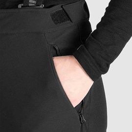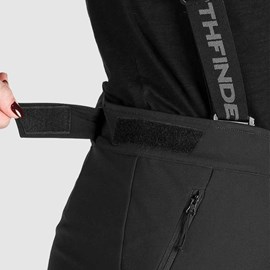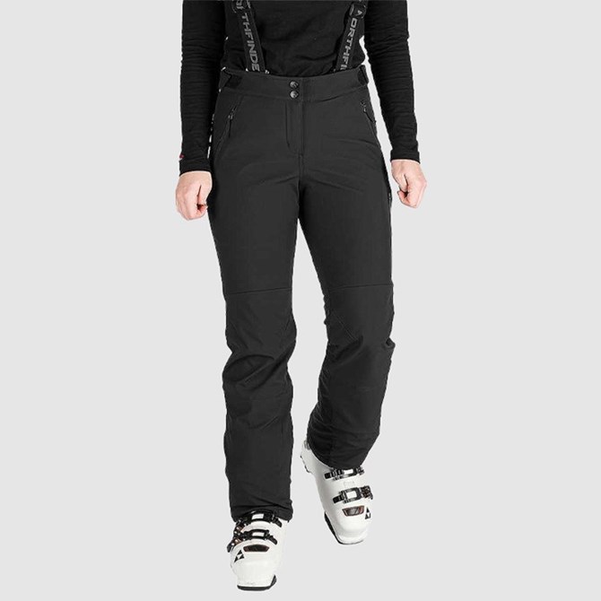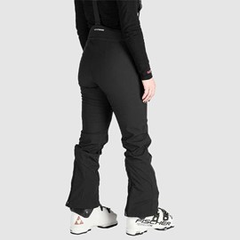 Ženske skijaške hlače izrađene od toplog troslojnog elastičnog softshella s vodenim stupcem i parametrima prozračnosti od 10.000 mm H₂O / 5.000 g/m²/24 h, zahvaljujući čemu podnose vlagu i umjereni vjetar uz održavanje dobre prozračnosti.